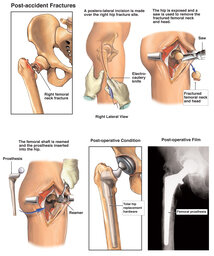 A physical therapist may teach the patient exercises, such as contracting and relaxing certain muscles, that can strengthen the hip. Because the new, artificial hip has a more limited range of movement than an undiseased hip, the physical therapist also will teach the patient proper techniques for simple activities of daily living, such as bending and sitting, to prevent injury to the new hip. As early as 1 to 2 days after surgery, a patient may be able to sit on the edge of the bed, stand, and even walk with assistance.
