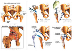 Hip replacement, or arthroplasty, is a surgical procedure in which the diseased parts of the hip joint are removed and replaced with new, artificial parts. These artificial parts are called the prosthesis. The goals of hip replacement surgery are to improve mobility by relieving pain and improve function of the hip joint.